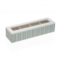 BOÎTE À THÉ RAYAS 4 EMPLACEMENTS Referencia: 21920358 Medidas: 32x9x7 cm. Material: Verre Bois MDF Papier Packaging: SAC PLASTIQUE Info: Certificado: FSC Propre conception