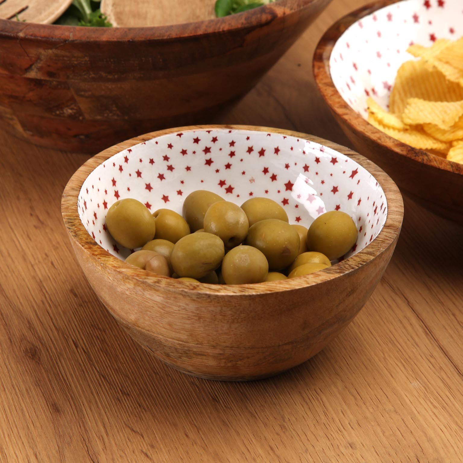 Fabriquée en bois de manguier, sa structure extérieure arbore un brun naturel chaleureux, tandis que l'intérieur est délicatement émaillé de blanc, orné de motifs étoilés rouges.