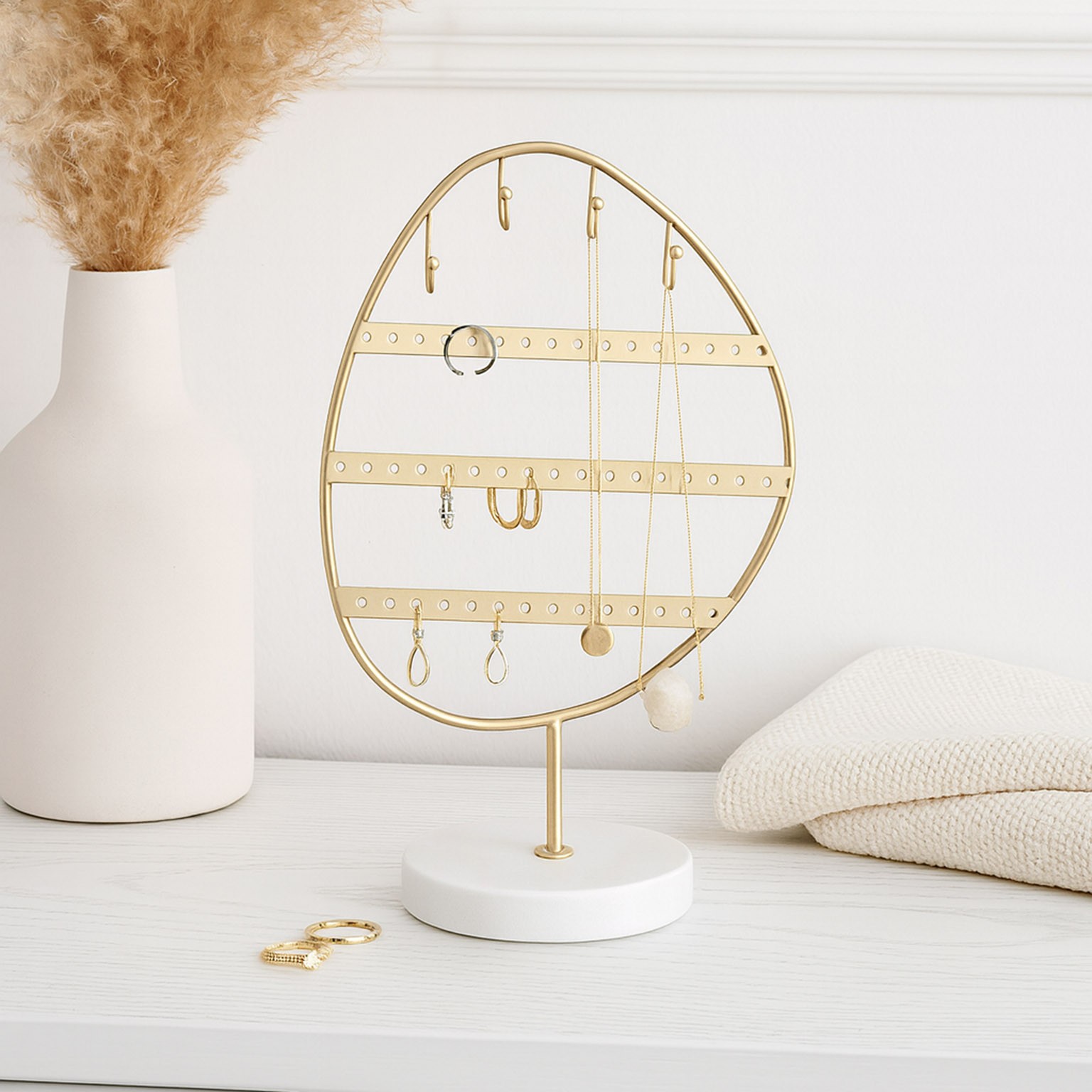 Fabriquée en métal doré, elle offre une structure moderne et minimaliste, idéale pour organiser colliers, bracelets, boucles d'oreilles et bagues.