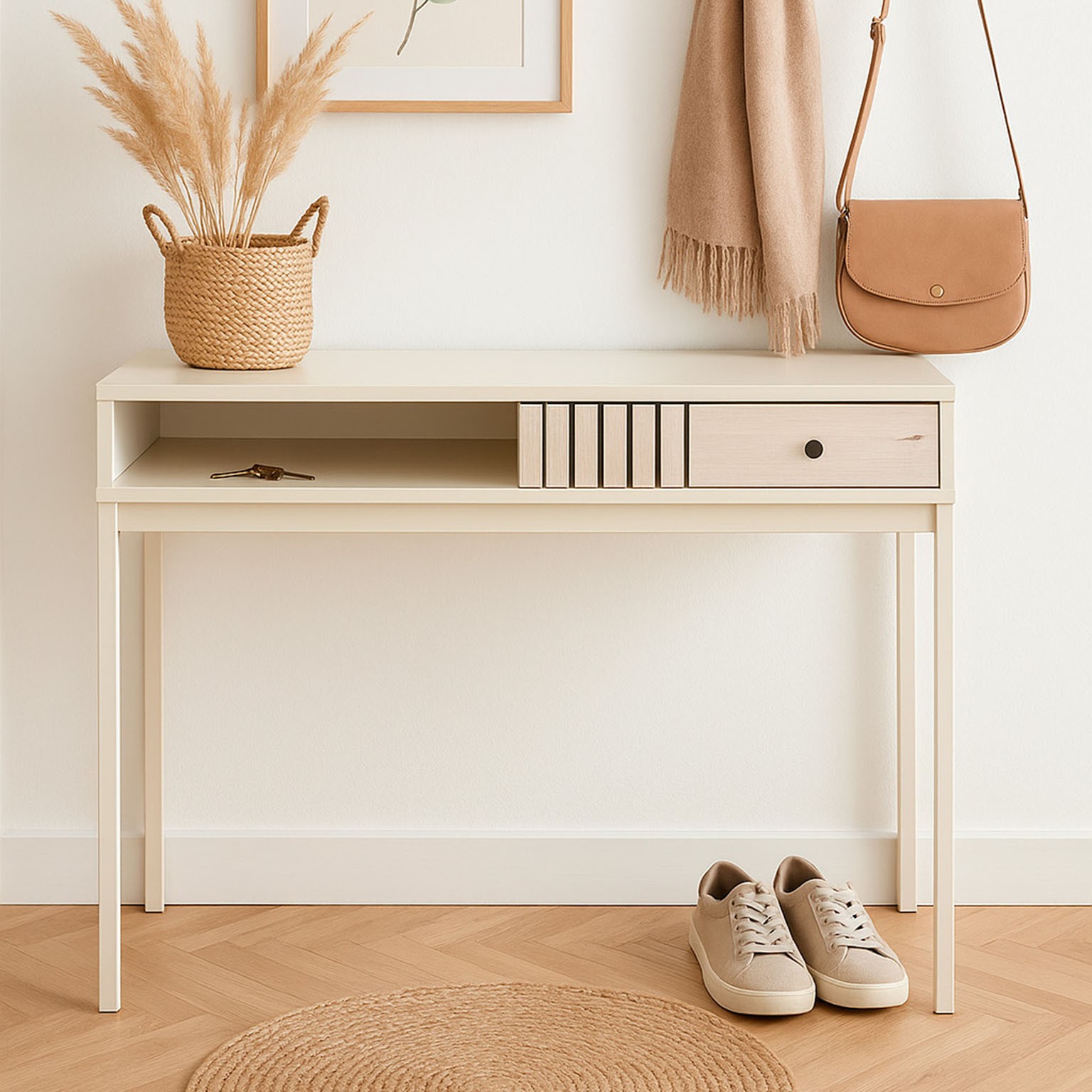 Son design minimaliste et ses tons neutres en font un meuble polyvalent, idéal pour le rangement des clés, sacs ou chaussures.