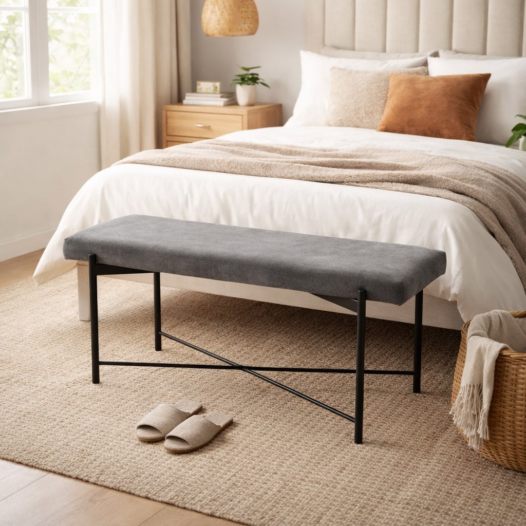 Idéal pour s'asseoir lors de l'habillage ou pour ranger des accessoires, il se marie parfaitement avec des lits modernes et des meubles en bois ou en métal.