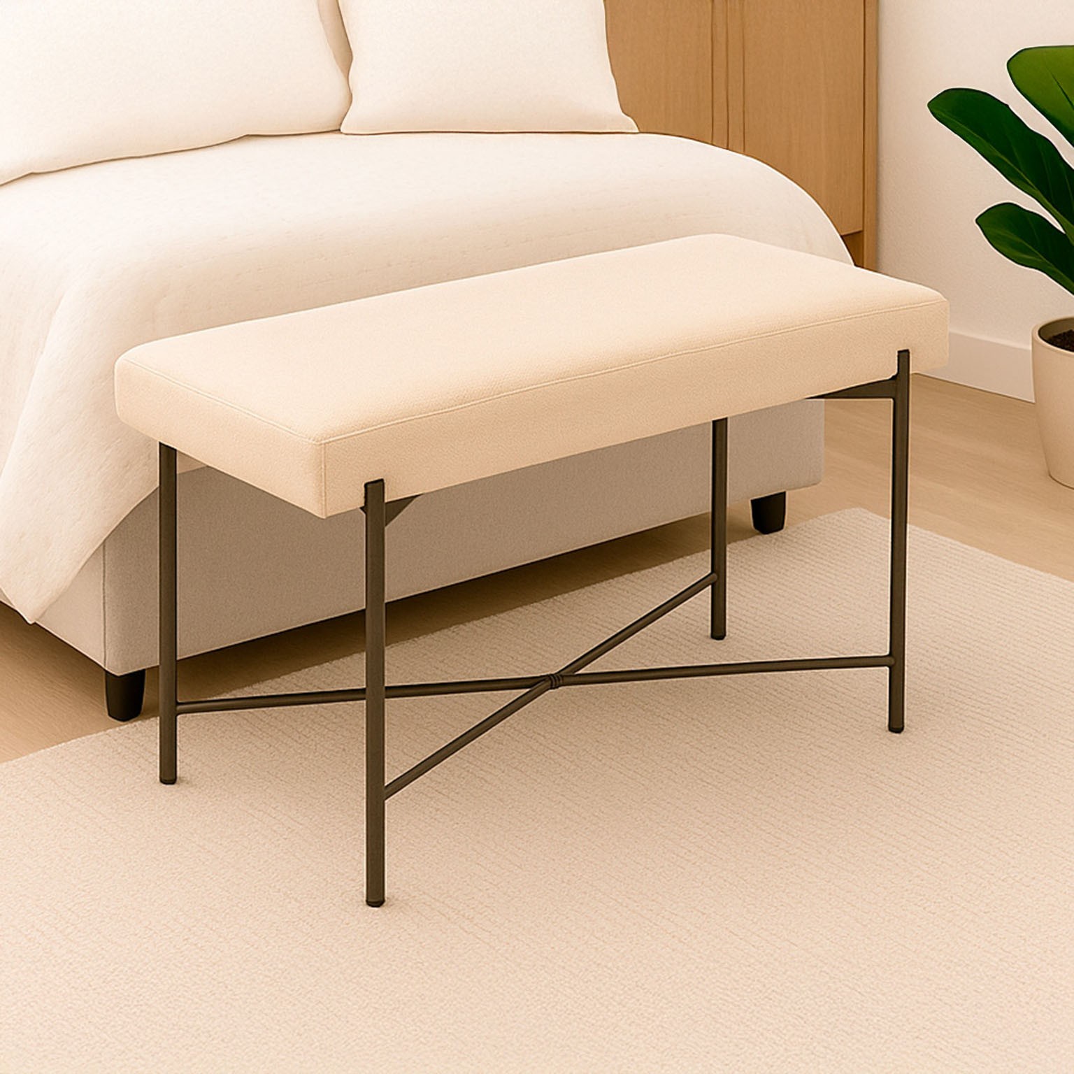 Le banc de lit Nilo beige est un meuble auxiliaire au design moderne et épuré, idéal pour divers espaces de la maison.