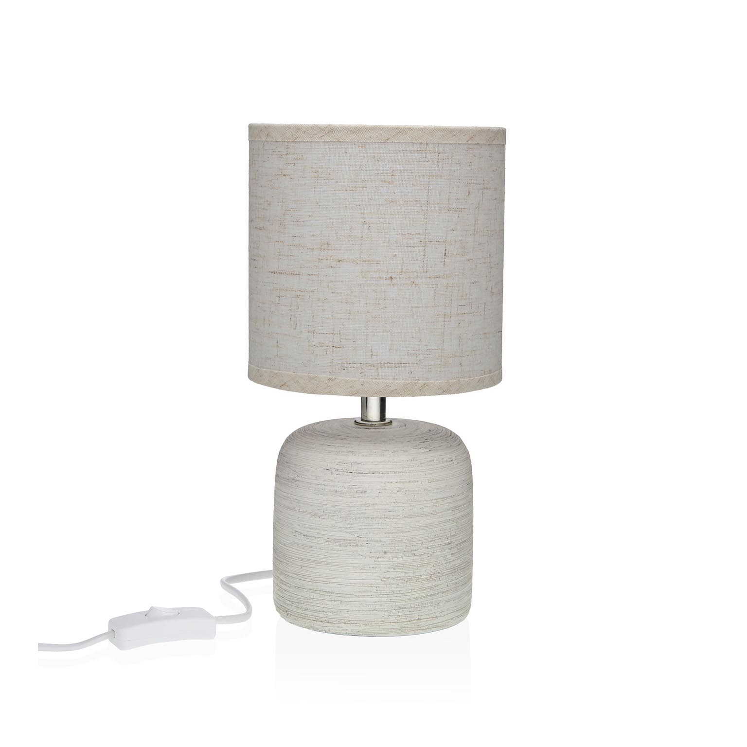 Sa base en céramique grise claire et son abat-jour en tissu aux teintes neutres créent une harmonie visuelle moderne et minimaliste.