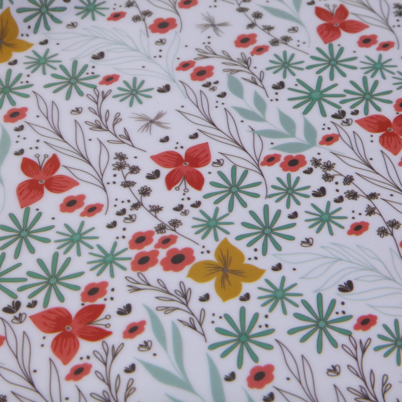 Son design élégant, orné de motifs floraux dans des teintes de blanc, rouge, vert, jaune et noir, s'intègre harmonieusement dans divers espaces de la maison, tels que la cuisine ou la salle à manger.