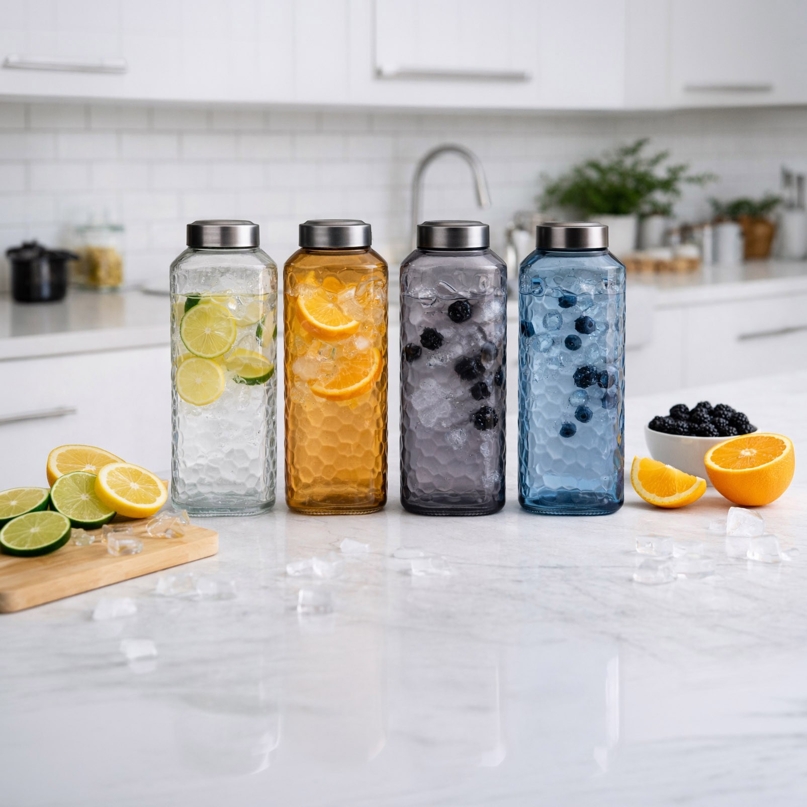 La bouteille en verre de 1,3L bleue allie fonctionnalité et esthétique moderne.