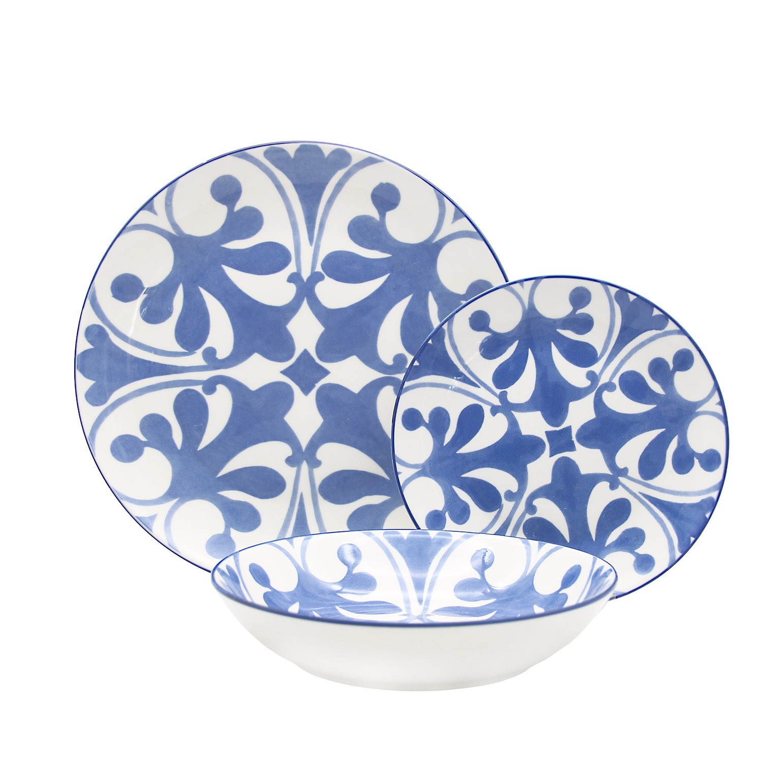 Ce set comprend 6 assiettes plates de 26,5 cm, 6 assiettes creuses de 23 cm et 6 assiettes à dessert de 19 cm, offrant une solution complète pour tous types de repas.