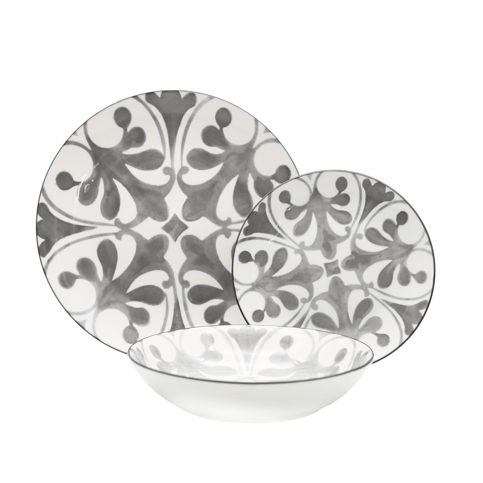 Ce set comprend 6 plats llanos de 26,5 cm, 6 plats hondos de 23 cm et 6 plats à dessert de 19 cm, idéal pour tous types de repas.