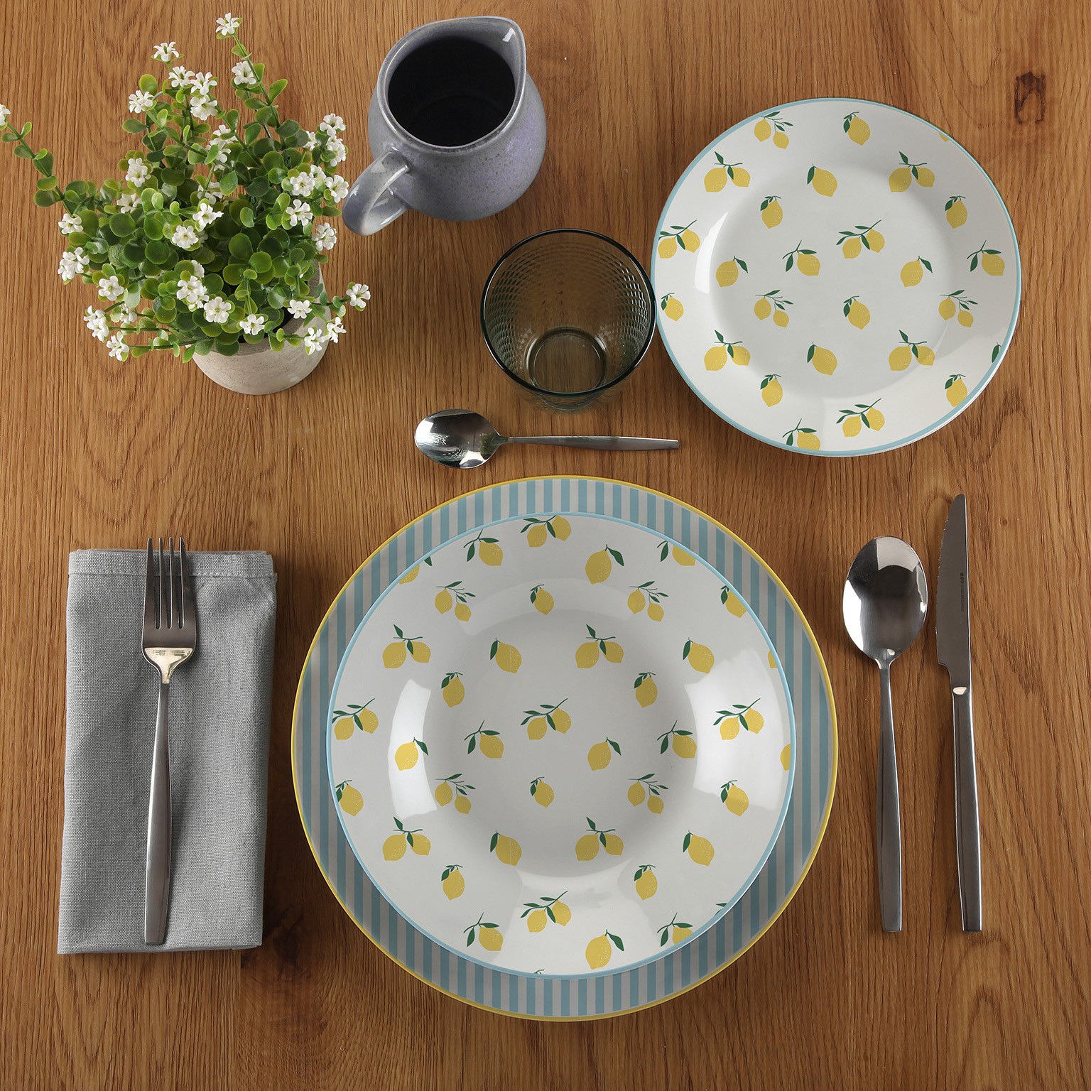 Ce set de 18 pièces comprend 6 assiettes plates de 26,5 cm, 6 assiettes creuses de 20 cm et 6 assiettes à dessert de 19 cm, parfaites pour tous types de repas.