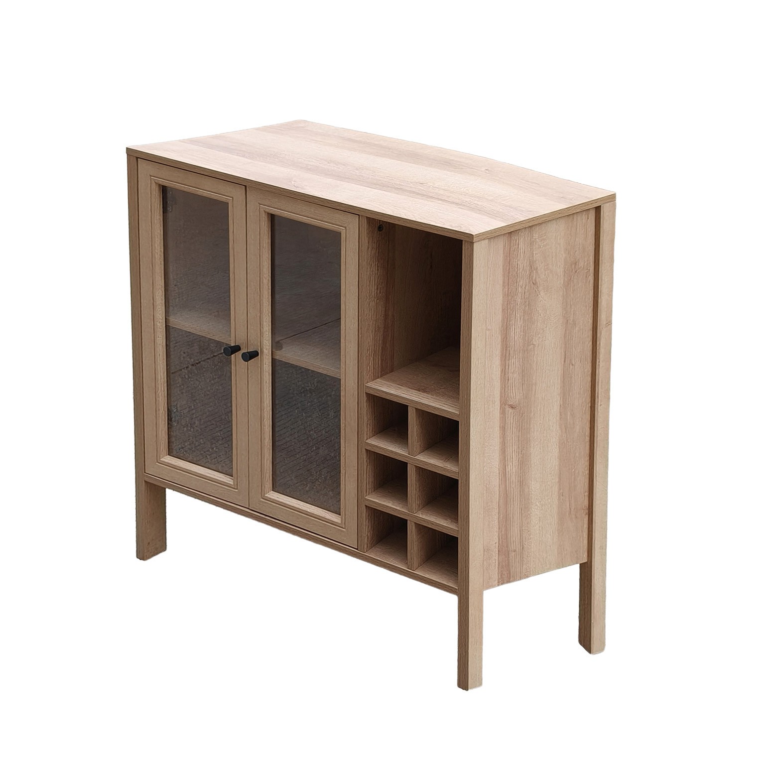 Conçu en bois MDF, pin et mélamine, avec des portes en verre, il présente des lignes épurées et une finition en teintes bois claires.